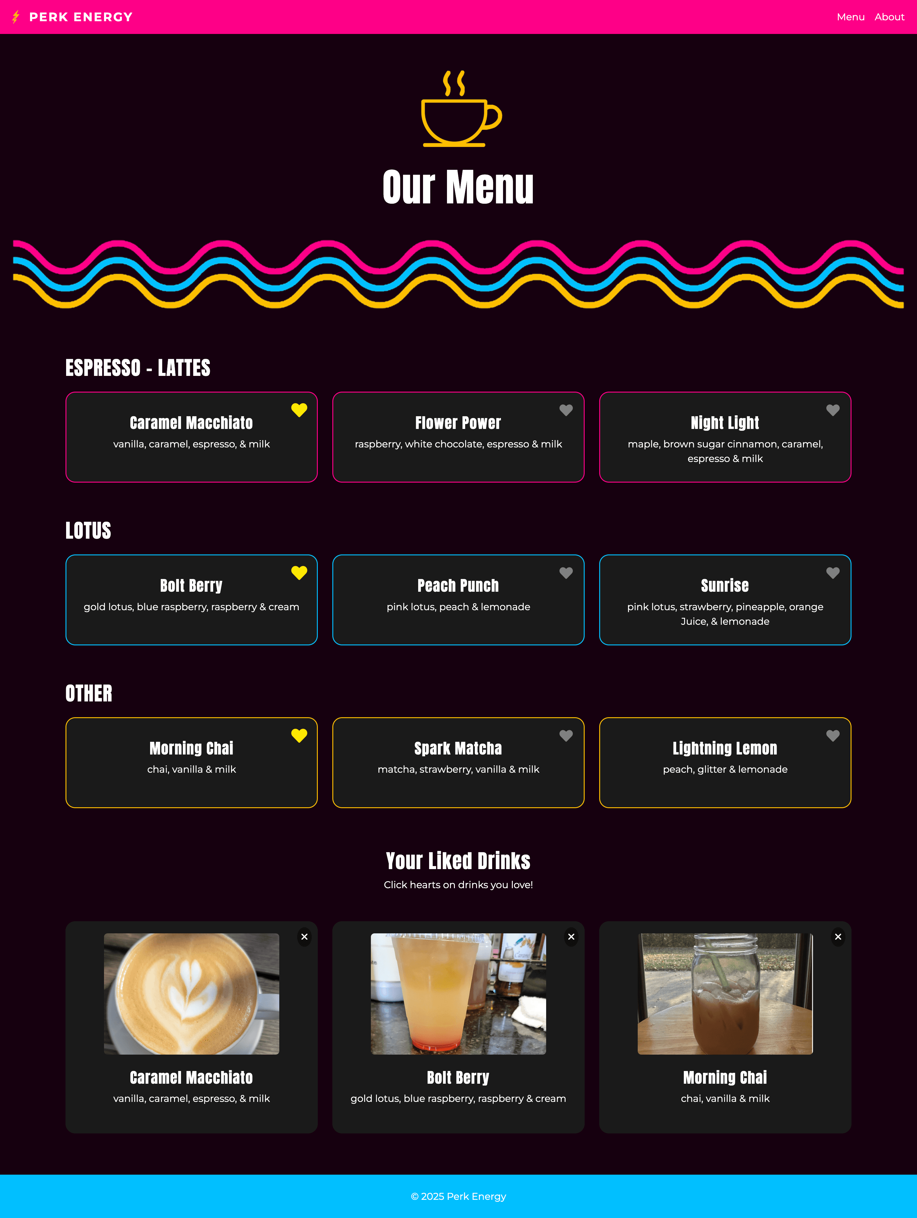 The menu page has categories to sort the different types of drinks. We added a lot of javascript onto this page so that you can like a drink and it will populate into the liked drinks section with a picture of that drink.