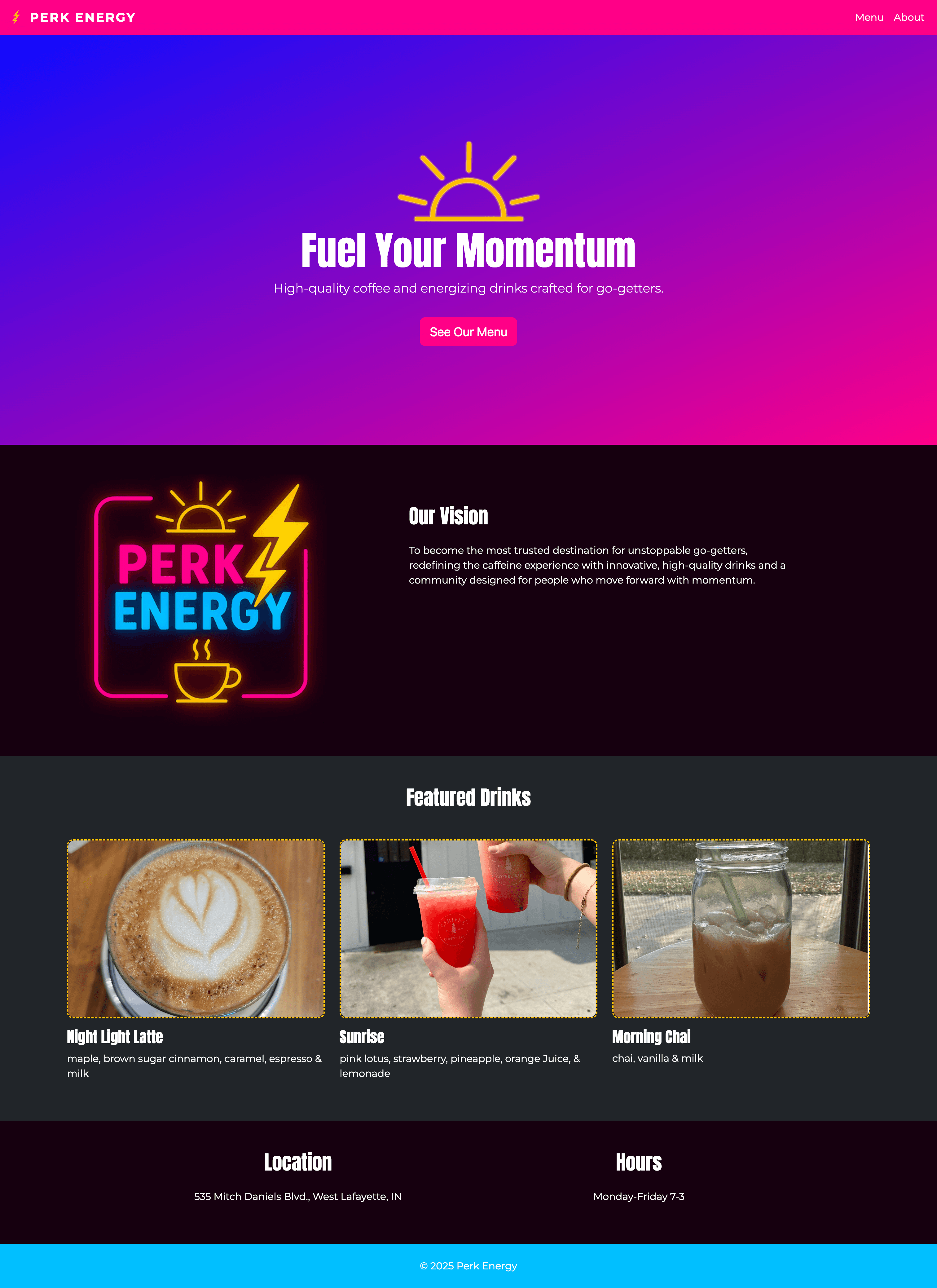 The about page is relatively simple and just shares our mission and vision for perk energy, as well as our hours and what lotus energy is.